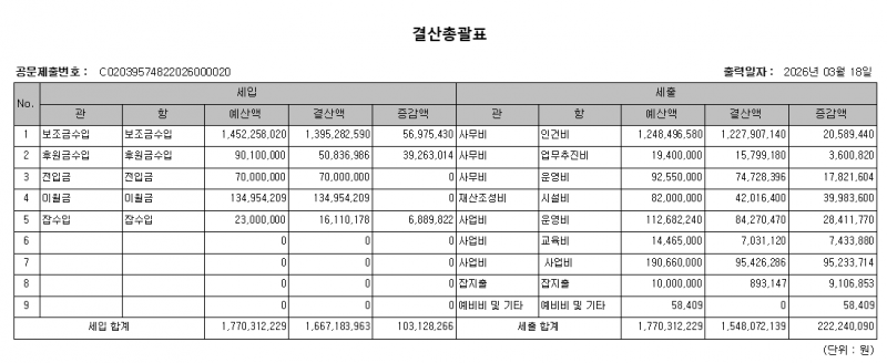 사회복지사업 법인 및 시설 재무회계 규칙 제19조 2항의 규정에 따라 사회복지법인 안음전복지재단 산하시설 새롬아동센터 2025년도 결산서를 다음과 같이 공고합니다.