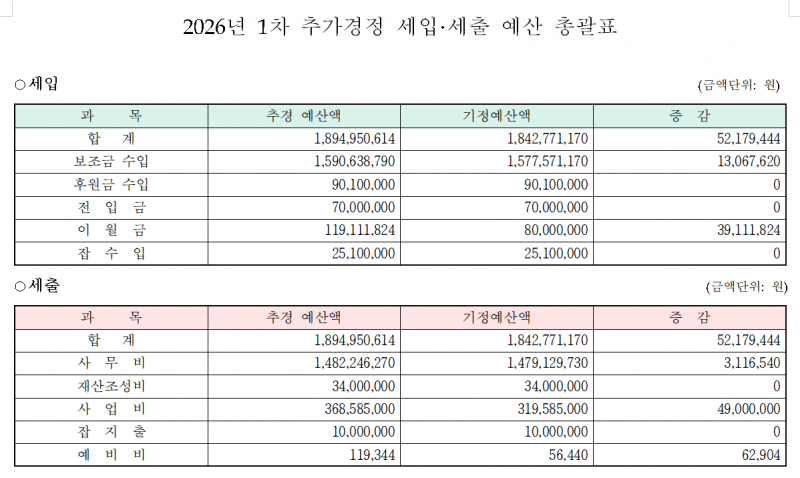 사회복지법인 및 사회복지시설 재무회계규칙 제 13조(추가경정예산) 및 제 10조(예산의 편성 및 결정절차)에 의거 사회복지법인 안음전복지재단 산하 새롬아동센터의 2026년도 제1차 추가경정 세입·세출 예산을 다음과 같이 공고합니다.