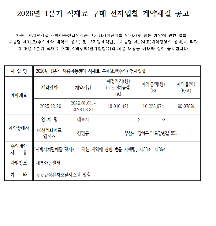 2026년 1분기 식재료 구매 전자입찰 계약체결 공고