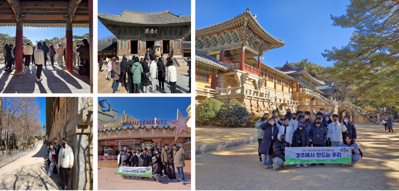정서ㆍ사회성 발달 프로그램(내 안에 우리) "경주에서 만드는 우리"(2026.02.09.) 페이지 정보 작성자 최고관리자 작성일26-02-23 15:23 조회15회 관련링크 다음글 목록 본문 2026.02.09. 새롬 아동들과 함께 경주 일원에서 "경주에서 만드는 우리"프로그램을 진행하였습니다. 불국사, 석굴암 등 천년고도 신라의 숨결을 느끼고 더불어 '눈치싸움'에서 승리한 새롬의 아동들은 경주월드에서 정말 신나는 하루를 보냈답니다. 다음글 목록
